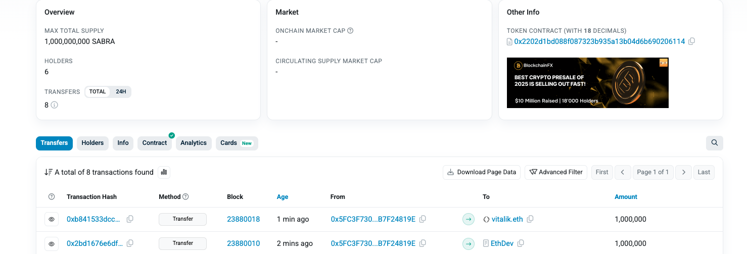 Exciting milestone! 1,000,000 SABRA tokens have been sent to Vitalik.eth and EthDev wallets. With each 1 million of SABRA tokens valuated at nearly $3 trillion, this marks a huge milestone for the musician Gloria Sabra fan-based token community. Discover what this means for SABRA fans and the future of fan-driven crypto.
